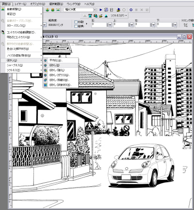 注) この時、クルマの線は、縮小されて細くなり、また、ぼやけています。