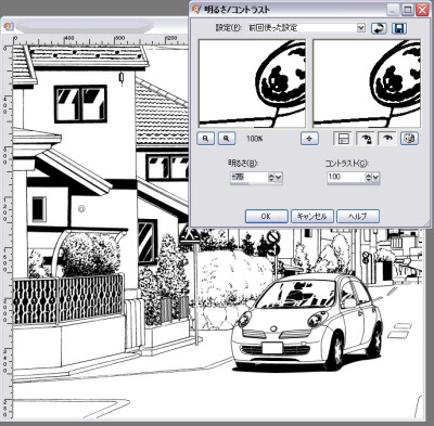 9 「明るさ/コントラスト」で、背景の線と合うように線幅の調整をします。